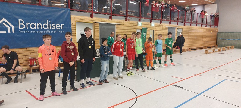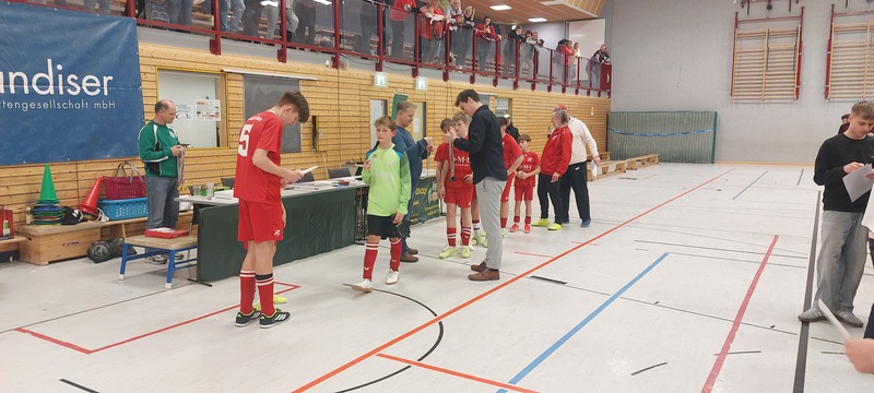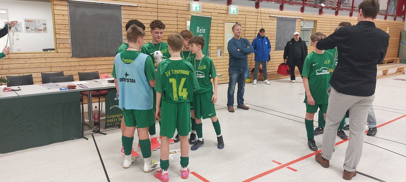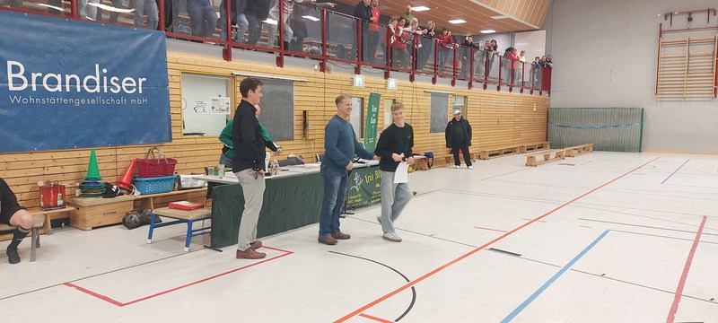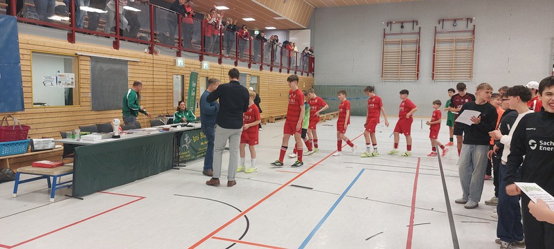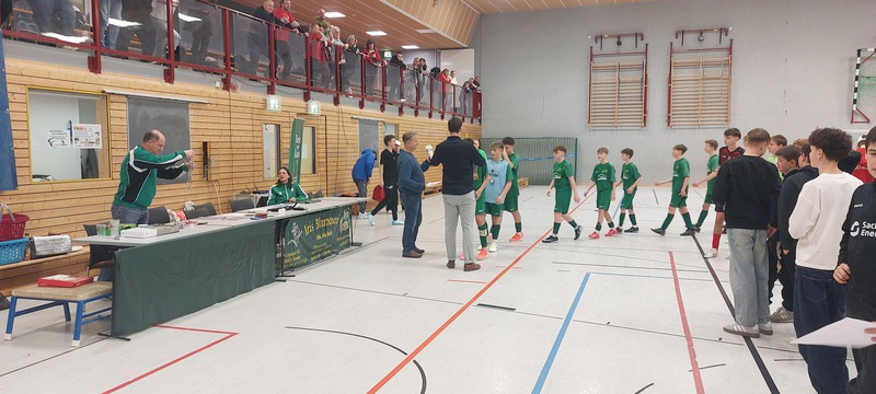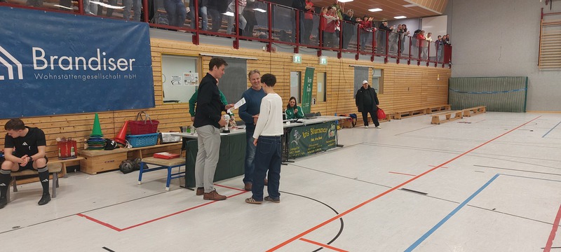 Tore, Spannung und echte Nervenstärke: Das C-Jugend Turnier der 19. Hallencupserie zeigte alles was den Fußballsport in der Halle ausmacht. Besonders das Finale bot Dramatik bis zum letzten Neunmeter. Die SpG Hartha / Leisnig und der SV Tresenwald lieferten sich ein irres Endspiel, das wohl allen noch lange in Erinnerung bleiben dürfte. Dabei führte die fast nur aus Leisniger Spielern bestehende Spielgemeinschaft bereits mit 3-0, ehe Robin Giesa vom SV Tresenwald in den Schlussminuten aufdrehte. Er glich die Partie nicht nur mit einem Hattrick im Alleingang zum 3-3 aus, sondern schoss sich mit insgesamt 8 Treffern auch zum besten Torschützen des Turniers. Nach 12 Minuten musste somit ein XXL Neunmeterschießen entscheiden. Dort hatte der SV Tresenwald mit 8-7 das glücklichere Ende für sich und gewann den Siegerpokal und die Goldmedaillen, während die Leisniger Jungs sich mit Silber begnügen mussten. In der Vorrunde Gruppe A spielten beide Finalisten schon einmal gegeneinander. Dabei gewann Leisnig noch deutlich mit 5-0, und zog mit voller Punktzahl (9 Punkte) ins Halbfinale ein. Durch ein hohes 7-0 gegen Belgershain hatte sich Tresenwald (4 Punkte / 8-6 Tore) dann aber durch das bessere Torverhältnis gegen Gastgeber Brandis (4 Punkte / 4-5 Tore) ins Halbfinale gerettet. In Gruppe B qualifizieren sich Bennewitz (7 Punkte) und Holzhausen (6 Punkte) für das Halbfinale. Der FSV 1921 Brandis startete mit einem 1-1 gegen Tresenwald und einem 3-0 gegen Belgershain ordentlich ins Turnier. Durch das 0-4 gegen Leisnig fiel das von Kai Kögler und Lukas Sommer trainierte FSV Team noch auf Gruppenplatz drei zurück. In der Finalrunde verlor Brandis dann gegen die SpG Hohburg / Röcknitz /B. ebenfalls 0-4 und im Spiel um Platz 7 besiegte man den SV 1863 Belgershain erst mit 2-1 (0-0) im Neunmeterduell. Das Spiel um Platz 5 wurde ebenfalls durch ein Neunmeterschießen entschieden. Hier gewann die SpG Wermsdorf / Luppa gegen Hohburg / Röcknitz /B. mit 5-4 (2-2). Auch in der Begegnung im kleinen Finale musste die Entscheidung vom Neunmeterpunkt fallen. Hier setzte sich der SV Blau Weiß Bennewitz mit 3-1 (0-0) gegen den FC Eintracht Holzhausen durch und sicherte sich die Bronzemedaille. Besonders hervorzuheben ist das durchweg faire Verhalten aller teilnehmenden Mannschaften. Die Auszeichnungen nahmen die Sponsorenvertreter Falk Börner (Börner Haustechnik Brandis) und Franz Taubert ( Fahrschule Taubert Brandis) vor. Ein besonderer Dank gilt den engagierten Eltern der Brandiser Spieler sowie dem Organisationsteam, die mit ihrem Einsatz maßgeblich zum reibungslosen Ablauf des Turniers beitrugen.