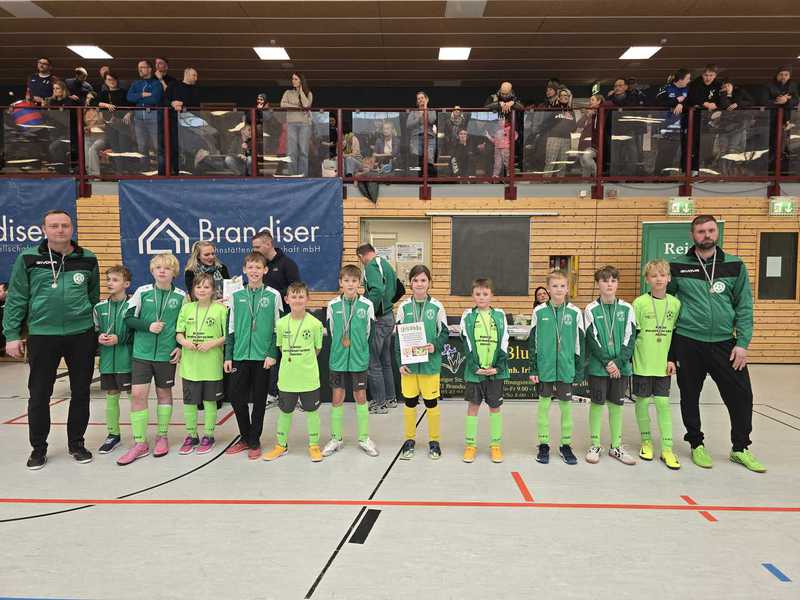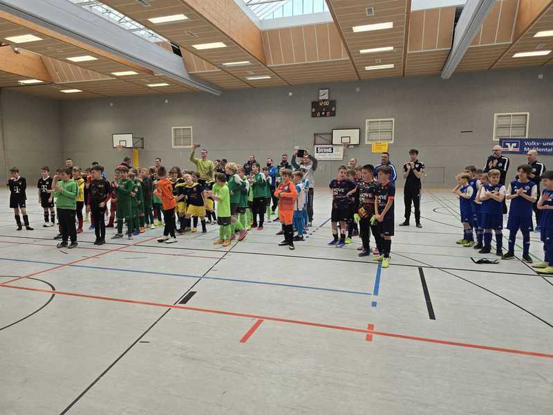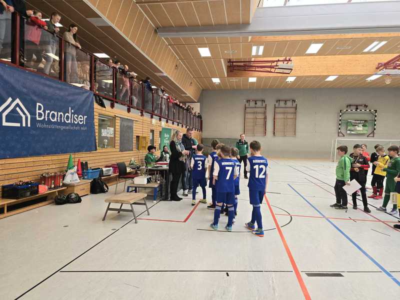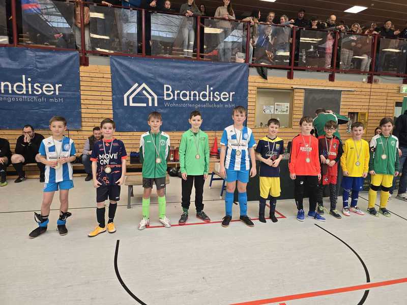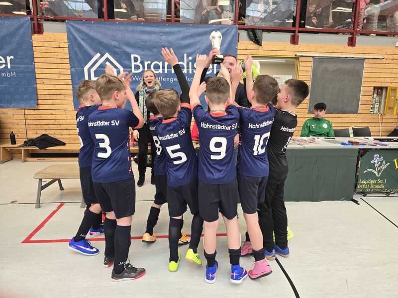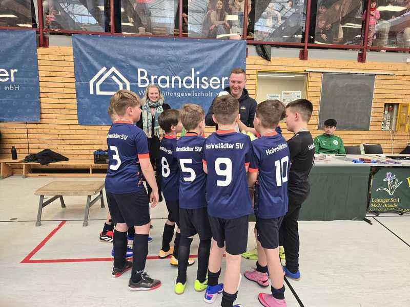 Das E-Jugend Turnier entwickelte sich zu einem der spannendsten Wettbewerbe der 19. Hallencupserie. Trotz nicht ausgeschriebener Jahrgangsbegrenzung präsentierten sich nahezu alle Mannschaften auf einem erstaunlich ausgeglichenen und spielerisch ansprechenden Niveau. Enge Spiele, knappe Ergebnisse und viel Einsatz prägten den Turnierverlauf. Den Turniersieg sicherte sich am Ende der Hohnstädter SV, der im Finale auf den SV Blau Weiß Bennewitz traf. Beide Teams hatten sich zuvor als Halbfinalisten der Gruppe A durchgesetzt. Nach zwölf umkämpften Minuten stand es torlos, sodass die Entscheidung im Neunmeterschießen fallen musste. Hier bewiesen die Hohnstädter Jungs die besseren Nerven und setzten sich mit 3-2 durch. Siegerpokal und Goldmedaillen gingen damit in den Grimmaer Ortsteil. Die Bennewitzer U10 zeigte ebenfalls eine starke Turnierleistung und durfte sich verdient über die Silbermedaillen freuen. Im Halbfinale hatten sie sich klar mit 3-0 gegen Klinga Ammelshain durchgesetzt. Mit dem gleichen Ergebnis gewann zuvor auch der HSV gegen Großsteinberg. Beide Finalisten hatten auch auf der gut gefüllten Tribüne der Mehrzweckhalle die lautstärksten „Fangruppen“, die vom Hohnstädter Anhang noch mit einer Dauertrommel Einlage getoppt wurde. Im Spiel um die Bronzemedaille setzte sich der SV Klinga Ammelshain im Nachbarortsduell gegen den TSV Großsteinberg mit 2-1 (1-1) vom Neunmeterpunkt durch. Das Spiel um Platz 5 gewann der FSV Blau Weiß Wermsdorf gegen das Gastgeber Team vom FSV 1921 Brandis mit 3-1. Die von Raik Kögler und Tom Hortig trainierten Brandiser Kicker hätten mit etwas mehr Konzentration auch um die Podestplätze mitspielen können. Im Vorrundenspiel gegen Großsteinberg fehlte beim 2-2 nur ein Tor zum Halbfinale. Im weiteren Saisonverlauf sollte hier besonders das Augenmerk auf ein besseres Zusammenspiel aller Mannschaftsteile gelegt werden. Platz 7 ging an den SV Panitzsch Borsdorf 1920 mit 3-0 gegen die E3 vom SV Tresenwald Machern. Am Ende des Tages stand bei allem sportlichen Ehrgeiz der gemeinsame Fußballspaß im Vordergrund. Als Anerkennung für ihre Leistungen erhielt auch beim E-Jugend Turnier jeder Teilnehmer eine Medaille. Überreicht wurden die Auszeichnungen von den Hallencupserie - Sponsorenpool Mitgliedern Frau Franziska Schulze (Bildungsakademie Bunge) und Herrn Christian Meding (Bäckerei Keller Machern). Der reibungslose Ablauf des Turniers war nicht zuletzt dem großen Engagement der mitwirkenden Eltern der Brandiser Mannschaft und der ehrenamtlichen Helfer des FSV Organisationsteams zu verdanken.